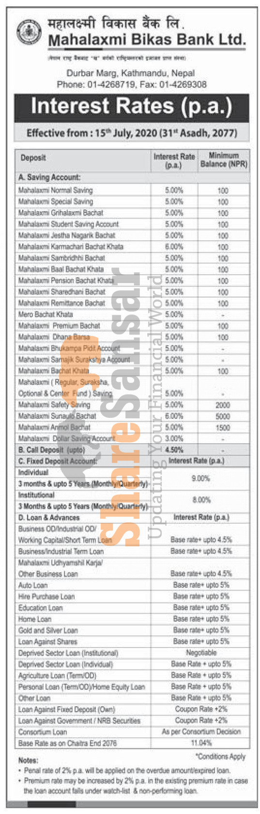 Mahalaxmi Bikas Bank Limited has published a notice regarding the interest rate on various deposit and loan products and its effective from 31st Ashad, 2077.