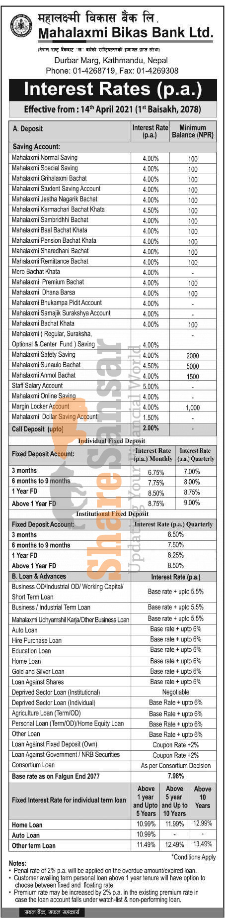 Mahalaxmi Bikas Bank Limited has published a notice regarding the new interest rate for deposit and loan products and it's effective from 1st Baisakh, 2078.
