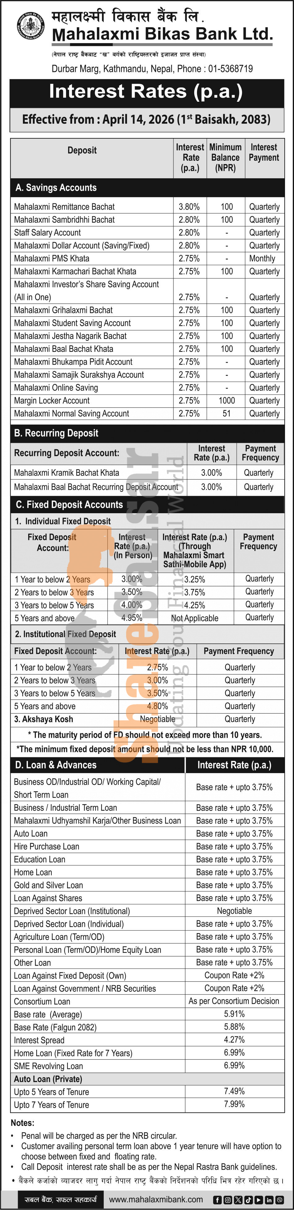 Mahalaxmi Bikas Bank Limited has published a notice regarding the new interest rate for deposit and loan products and it's effective from 1st Baisakh, 2083.