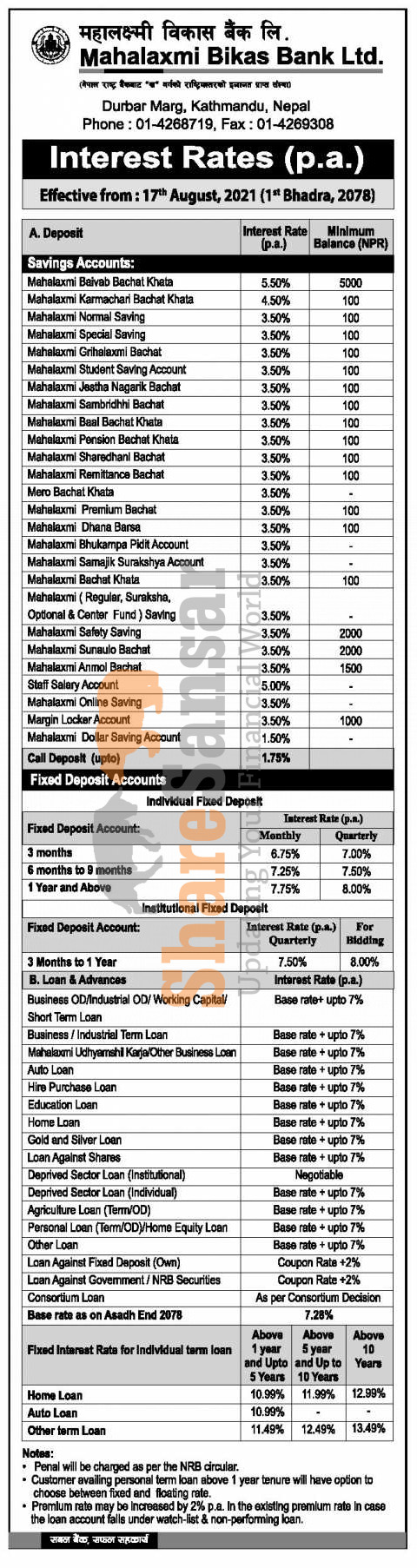 Mahalaxmi Bikas Bank Limited has published a notice regarding the new interest rate for deposit and loan products and it's effective from 1st Bhadra, 2078.