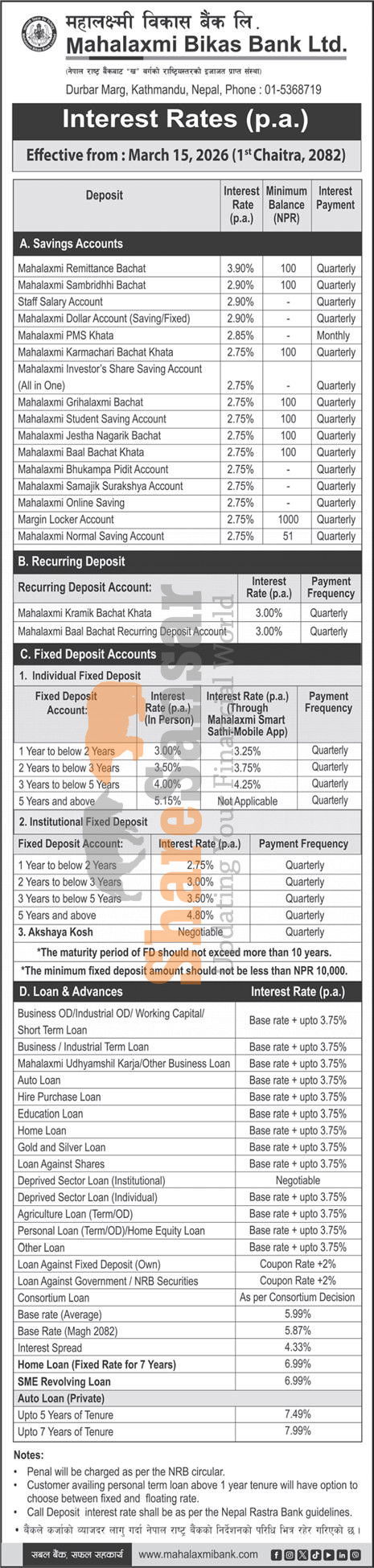 Mahalaxmi Bikas Bank Limited has published a notice regarding the new interest rate for deposit and loan products and it's effective from 1st Chaitra, 2082.