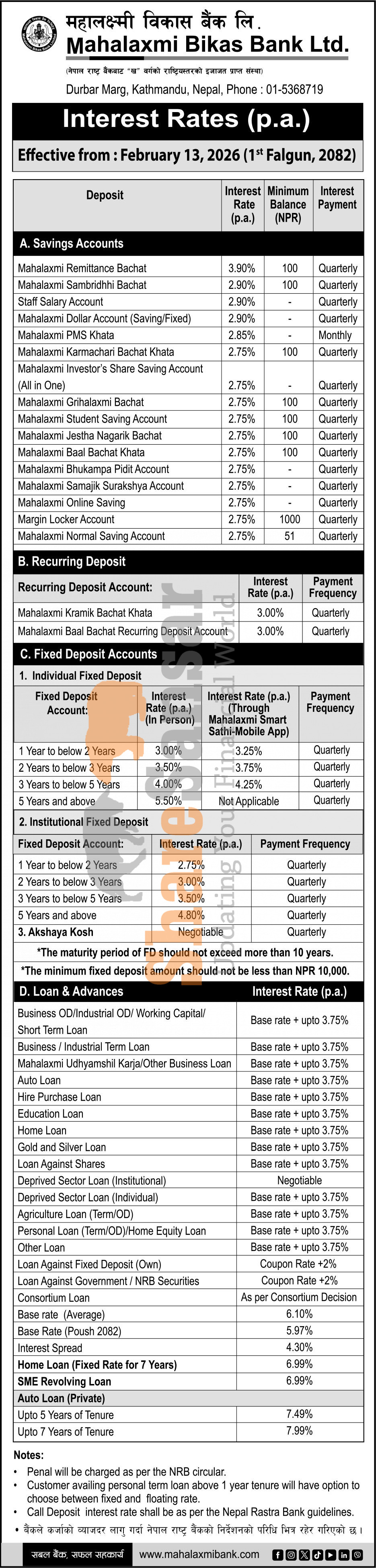 Mahalaxmi Bikas Bank Limited has published a notice regarding the new interest rate for deposit and loan products and it's effective from 1st Falgun, 2082.