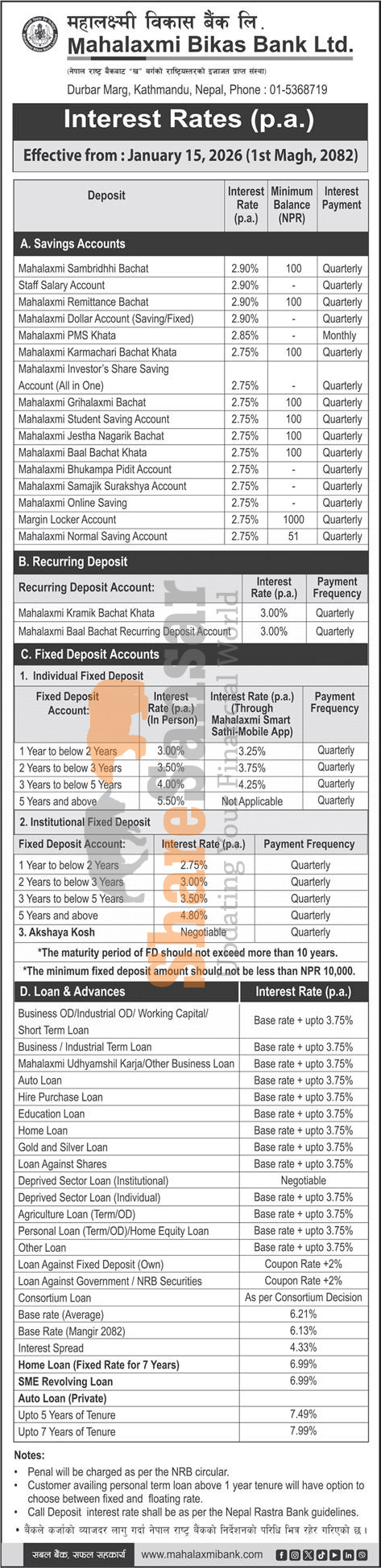 Mahalaxmi Bikas Bank Limited has published a notice regarding the new interest rate for deposit and loan products and it's effective from 1st Magh, 2082.