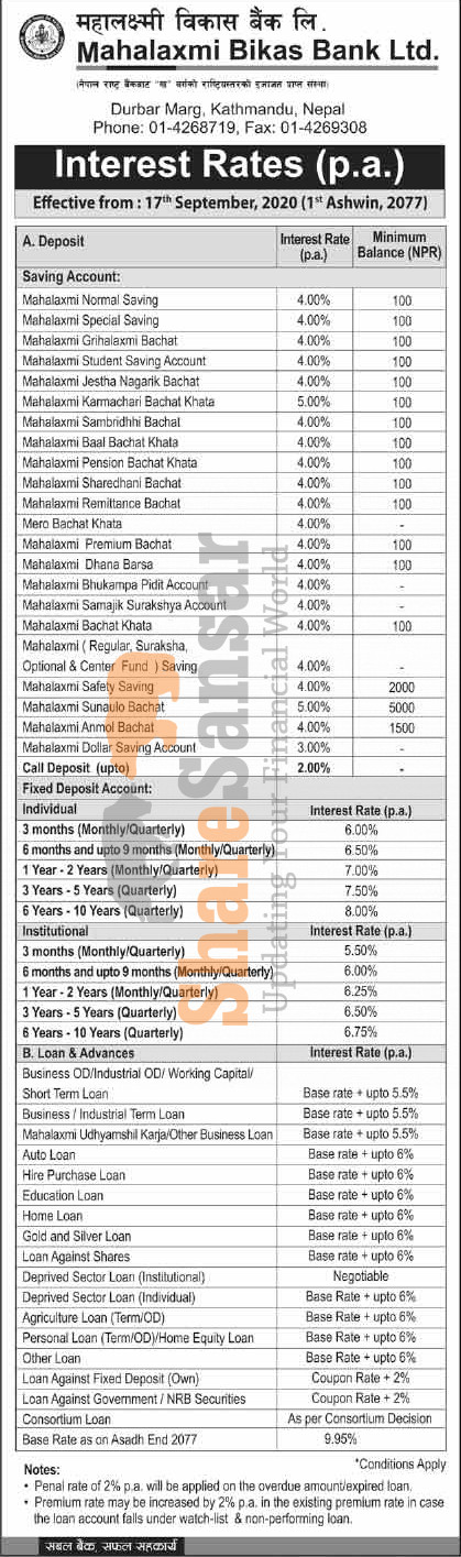 Mahalaxmi Bikas Bank Limited has published a notice regarding the new interest rate for its deposit and loan product and its effective from 1st Ashwin, 2077.
