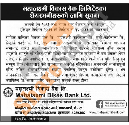 Mahalaxmi Bikas Bank Limited has published a notice to collect uncollected due dividend to its shareholders.