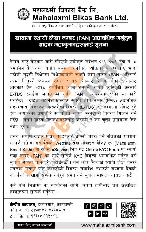 Mahalaxmi Bikas Bank Limited has urged its account holders to update their Permanent Account Number (PAN) for the E-TDS purpose.