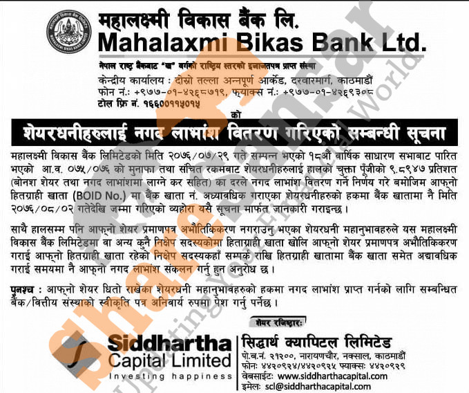 Mahalaxmi Bikas Bank Limited is distributing 9.89% cash dividend directly to bank accounts to its shareholders.