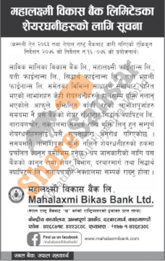 Mahalaxmi Bikas Bank Limited urges its shareholders to collect the uncollected due dividends.