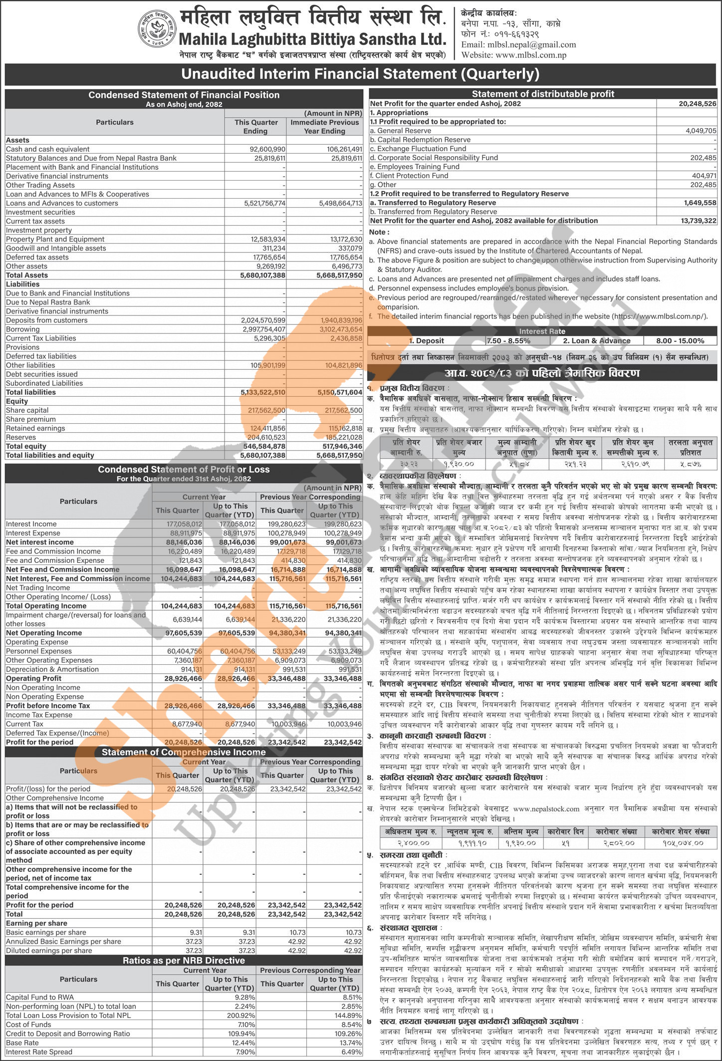 Mahila Laghubitta Bittiya Sanstha Limited has posted a net profit of Rs 20.24 million and published its 1st quarter company analysis of the fiscal year 2082/83.