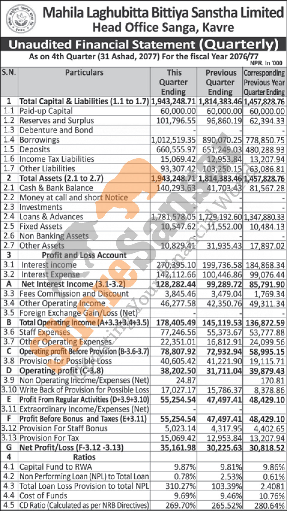 Mahila Laghubitta Bittiya Sanstha Limited has posted a net profit of Rs 35.16 million during the 4th quarter of the fiscal year 2076/77.