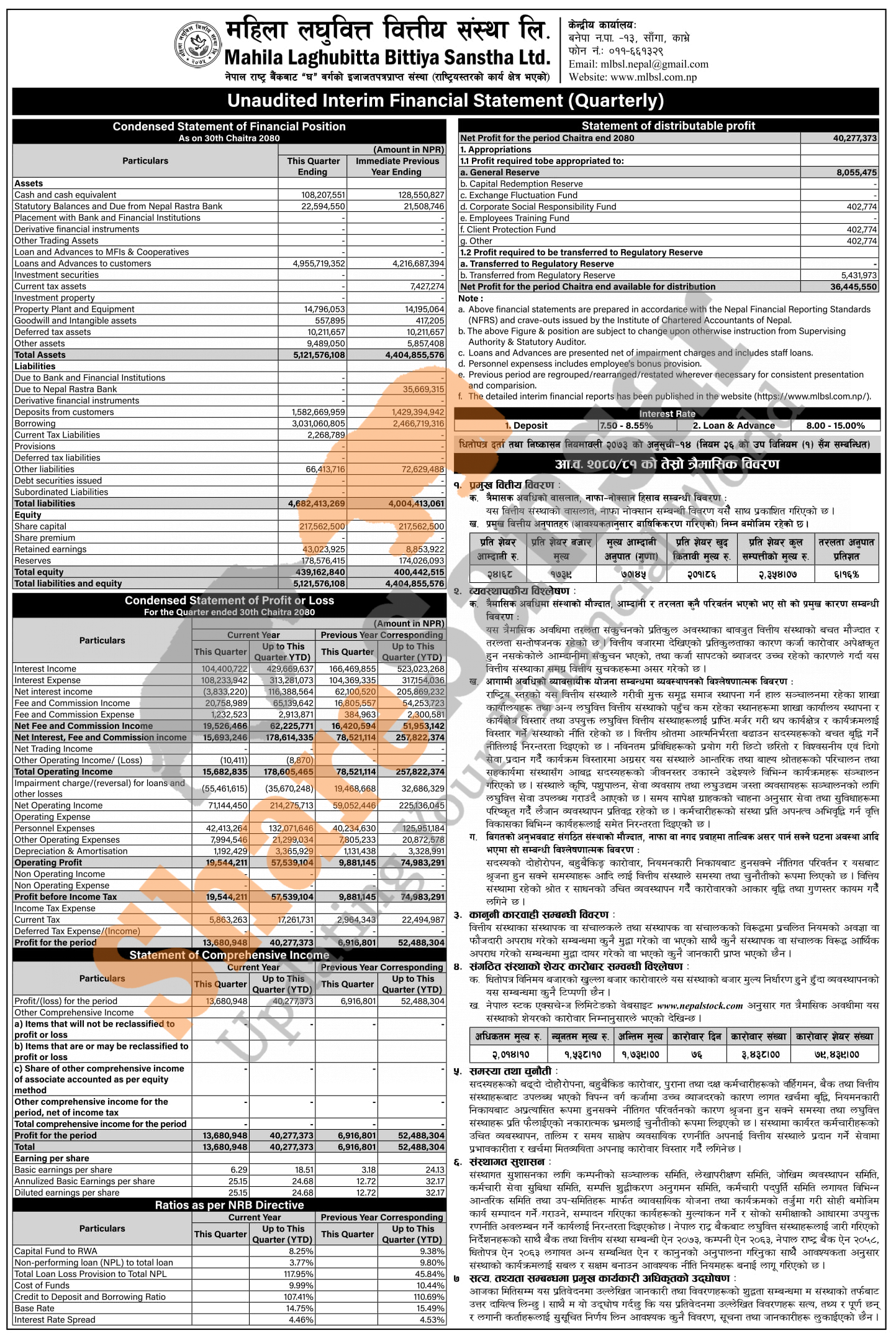 Mahila Laghubitta Bittiya Sanstha Limited has posted a net profit of Rs 40.27 million and published its 3rd quarter company analysis of the fiscal year 2080/81.