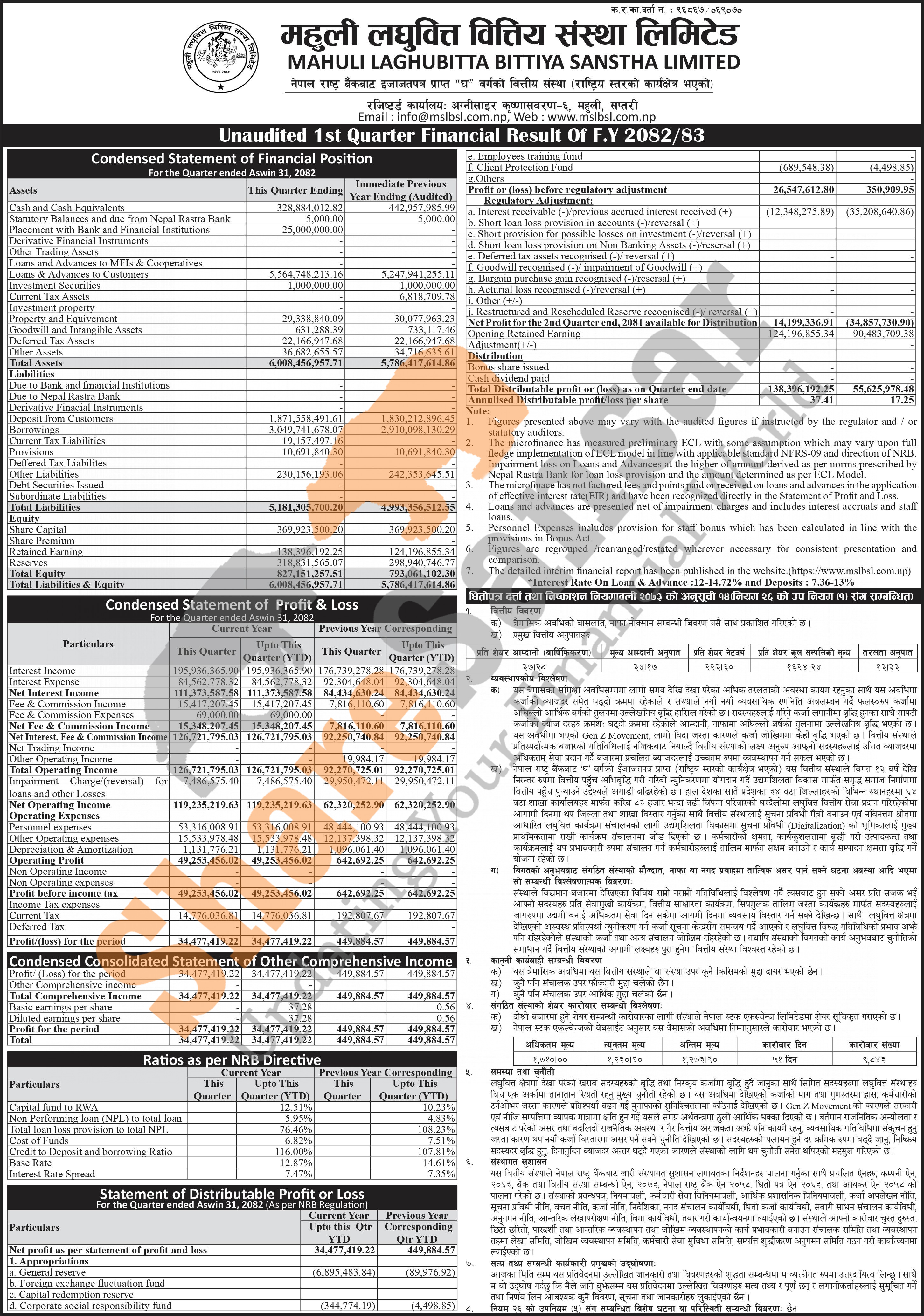 Mahuli Laghubitta Bittiya Sanstha Limited has posted a net profit of Rs 34.47 million and published its 1st quarter company analysis of the fiscal year 2082/83.