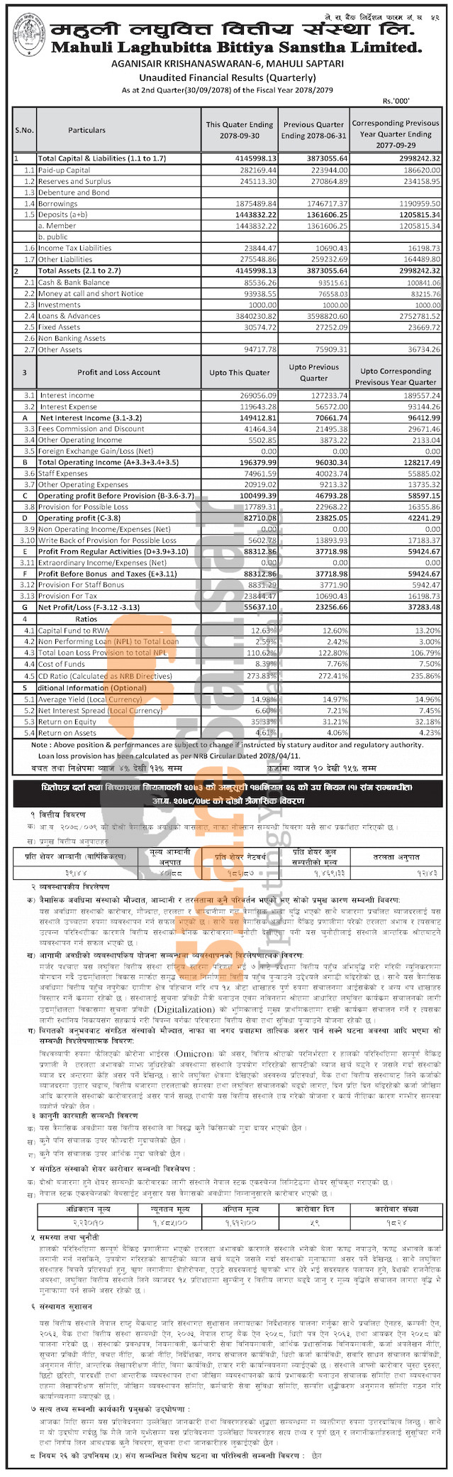 Mahuli Laghubitta Bittiya Sanstha Limited has posted a net profit of Rs 55.63 million and published its 2nd quarter company analysis of the fiscal year 2078/79.