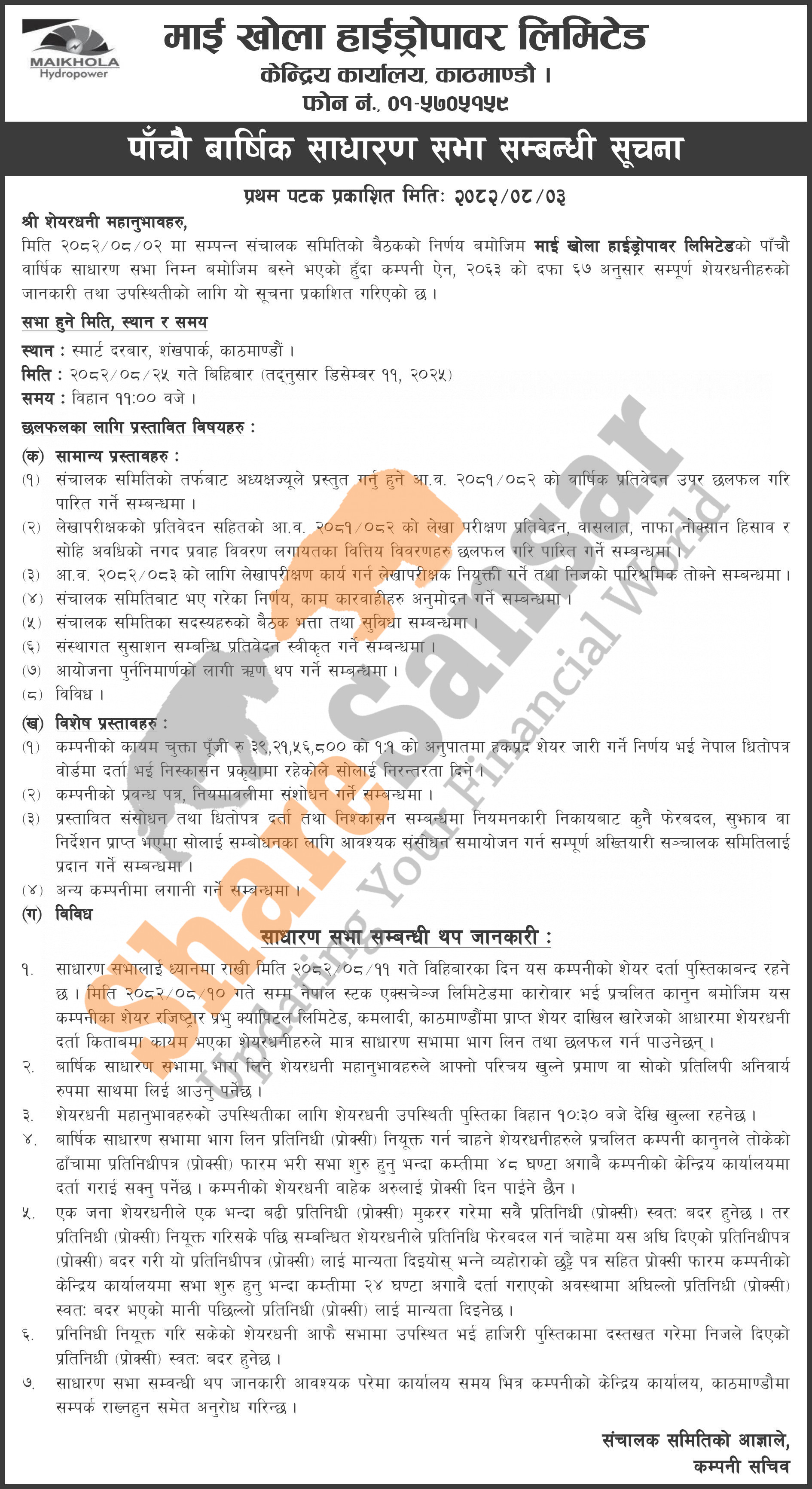 Mai Khola Hydropower Limited has announced its 5th AGM going to be held on 25th Mangsir, 2082.