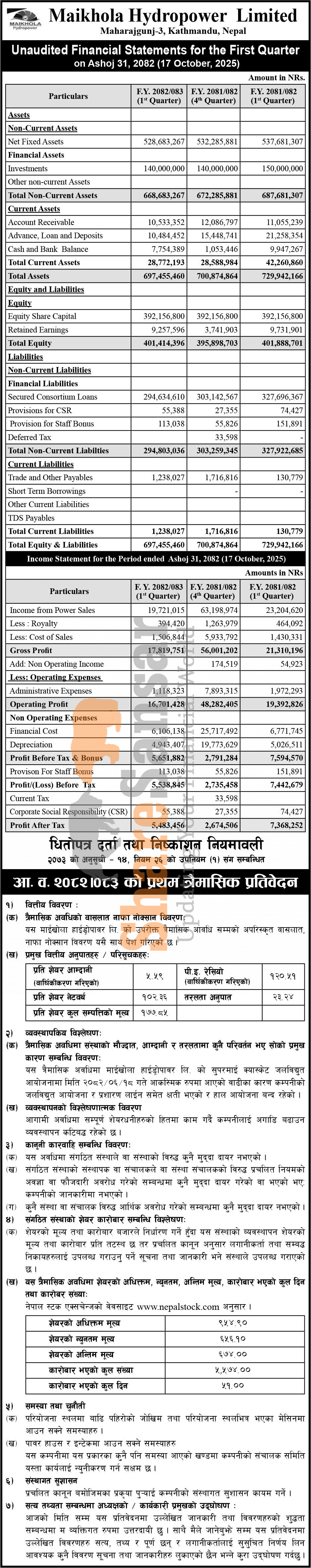 Mai Khola Hydropower Limited has posted a net profit of Rs 5.48 million and published its 1st quarter company analysis of the fiscal year 2082/83.