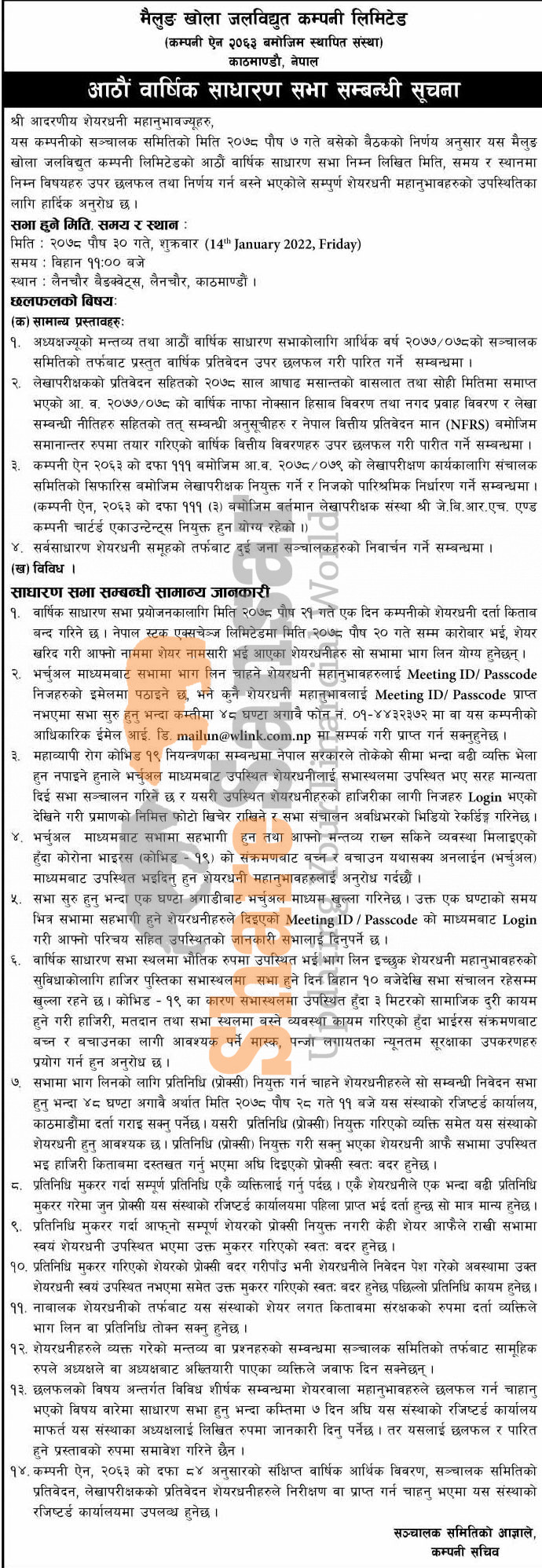 Mailung Khola Jal Vidhyut Company Limited has announced its 8th AGM going to be held on 30th Poush, 2078.