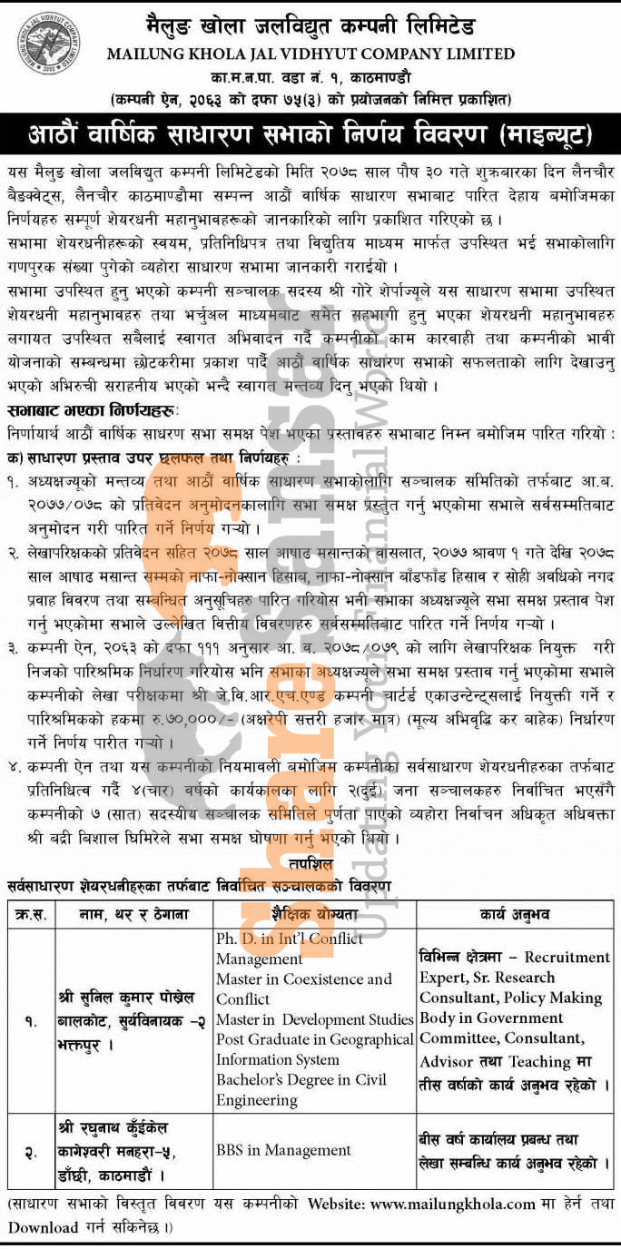 Mailung Khola Jal Vidhyut Company Limited has published the minutes of its 8th AGM.