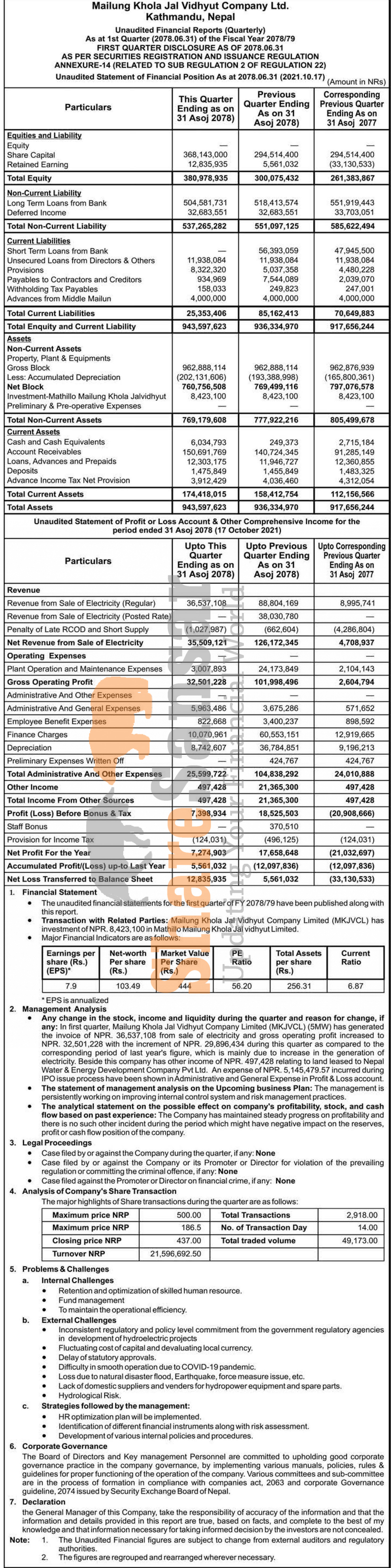 Mailung Khola Jal Vidhyut Company Limited has posted a net profit of Rs 7.27 million and published its 1st quarter company analysis of the fiscal year 2078/79.