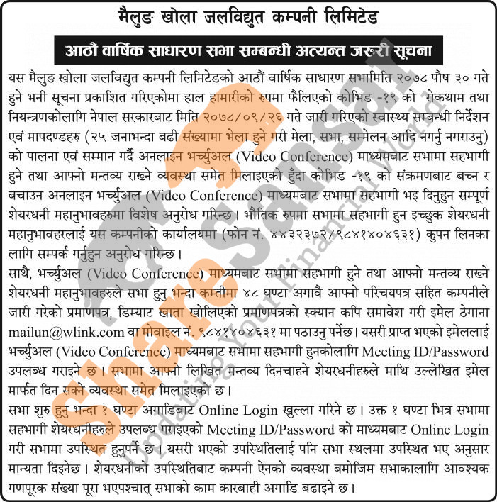 Mailung Khola Jalvidhyut Company Limited has published a notice regarding its upcoming 8th AGM to be conducted through virtual medium.