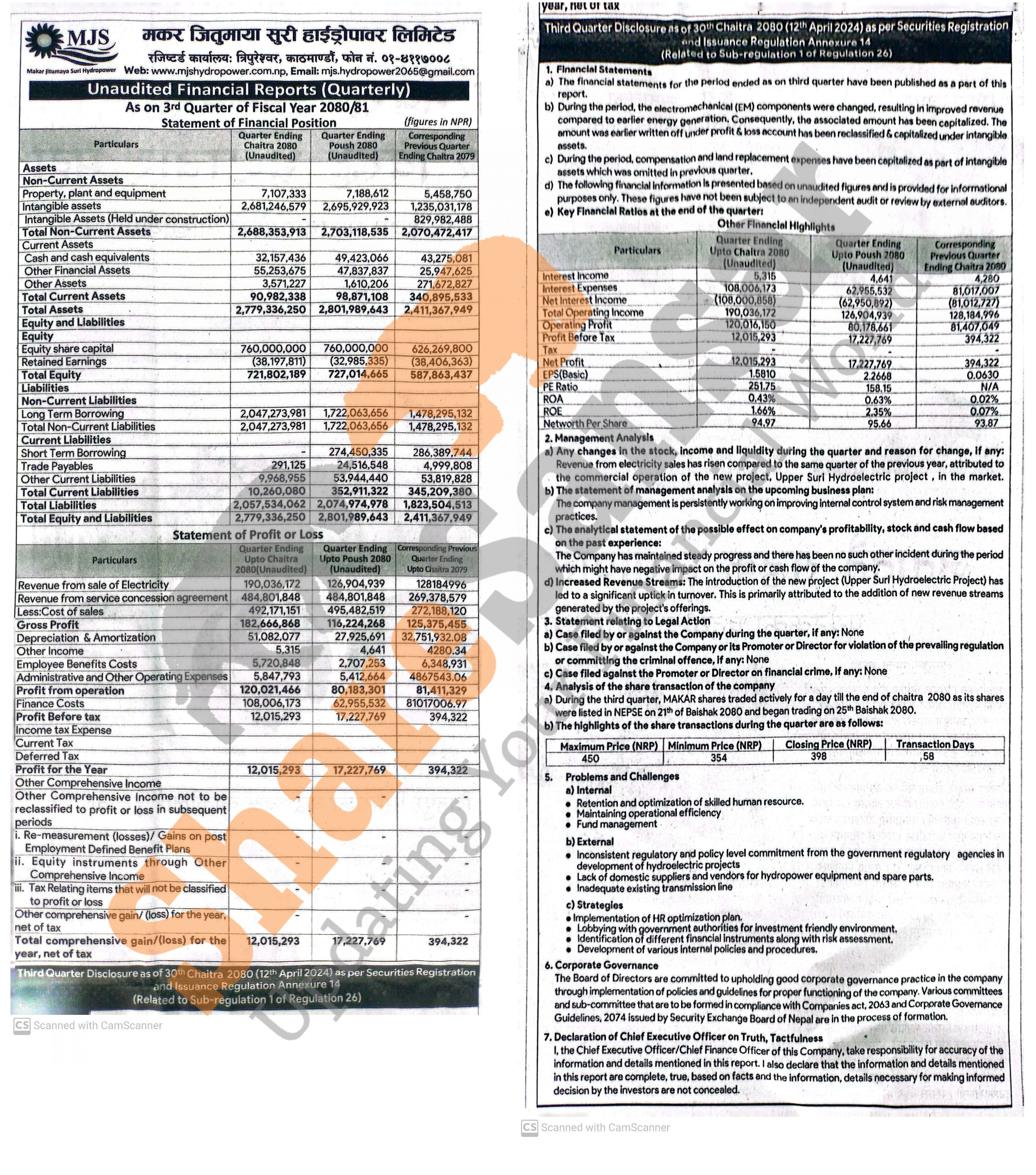 Makar Jitumaya Suri Hydropower Company Limited has posted a net profit of Rs 12.01 million and published its 3rd quarter company analysis of the fiscal year 2080/81.