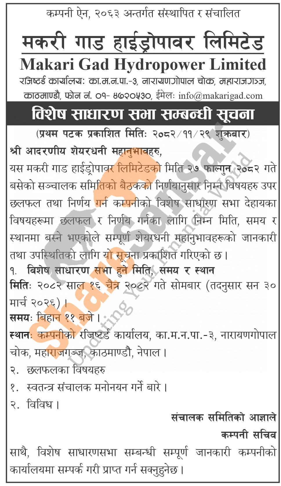 Makari Gad Hydropower Limited has announced its SGM going to be held on 16th Chaitra, 2082.