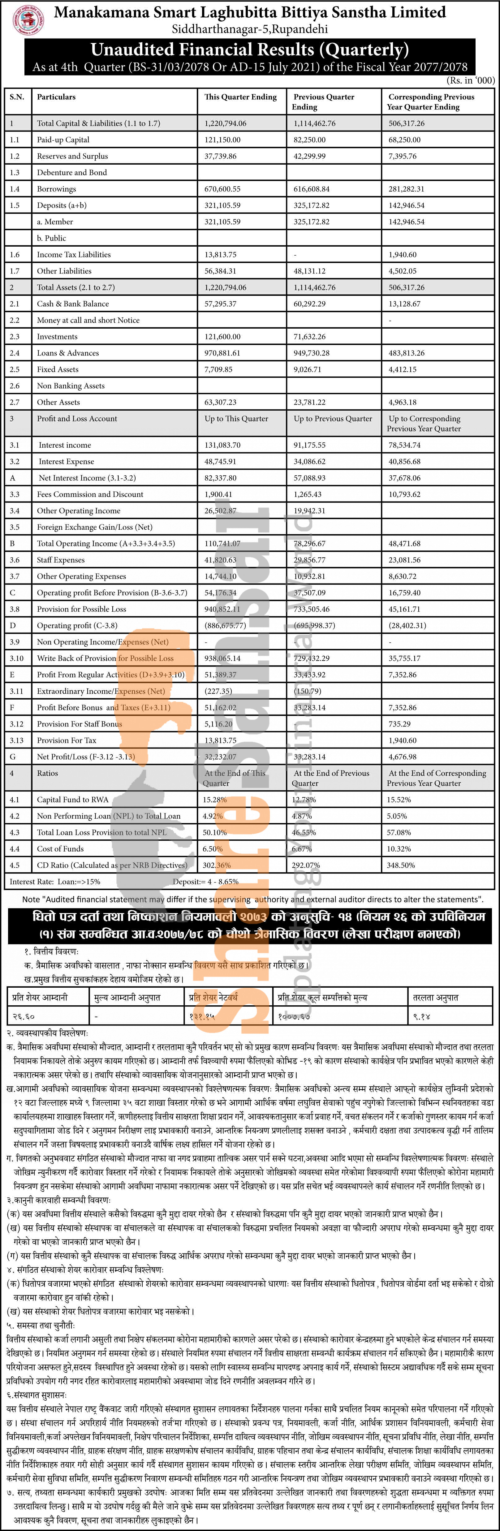 Manakamana Smart Laghubitta Bittiya Sanstha Limited has posted a net profit of Rs. 32.23 million during the 4th quarter of the fiscal year 2077/78.