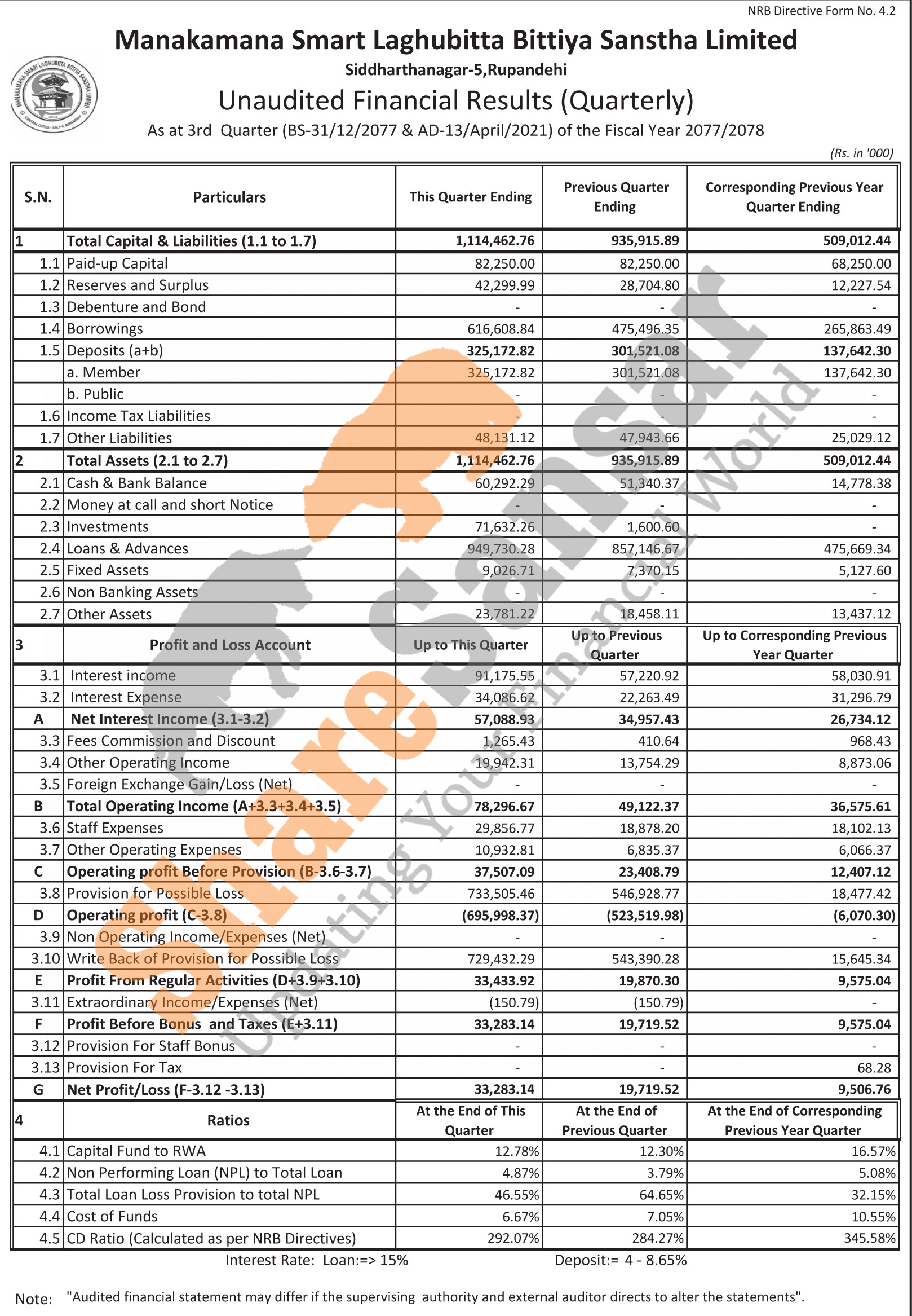Manakamana Smart Laghubitta Bittiya Sanstha Limited has posted a net profit of Rs. 33.28 million during the 3rd quarter of the fiscal year 2077/78.