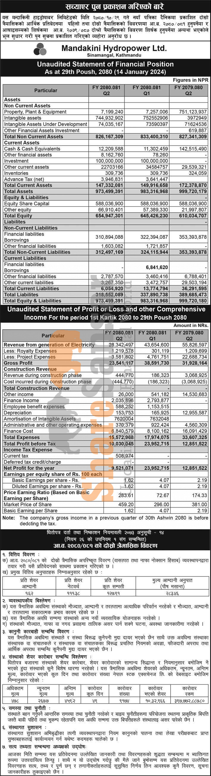 Mandakini Hydropower Limited has made correction on its 2nd quarter company analysis of the fiscal year 2080/81.
