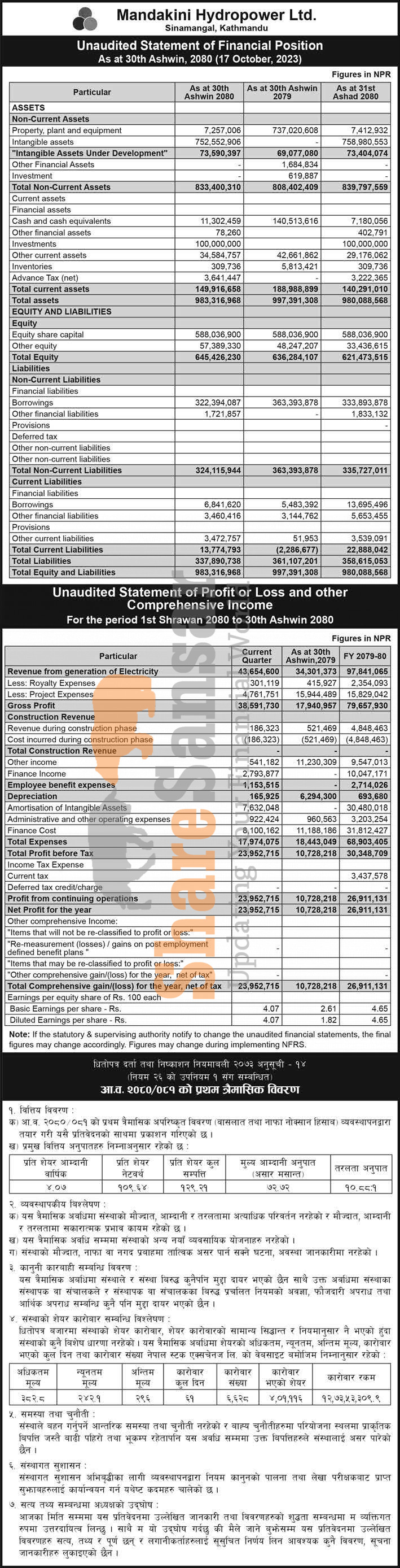 Mandakini Hydropower Limited has posted a net profit of Rs 23.95 million during the 1st quarter of the fiscal year 2080/81.