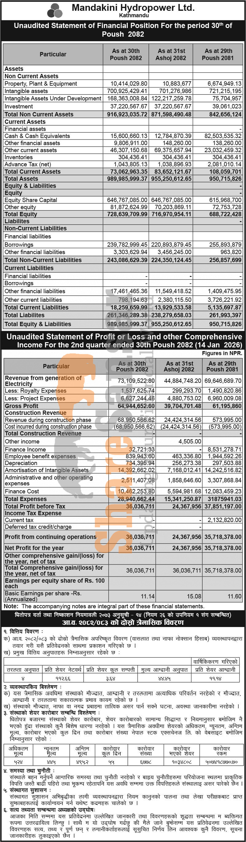 Mandakini Hydropower Limited has posted a net profit of Rs 36.03 million and published its 2nd quarter company analysis of the fiscal year 2082/83.
