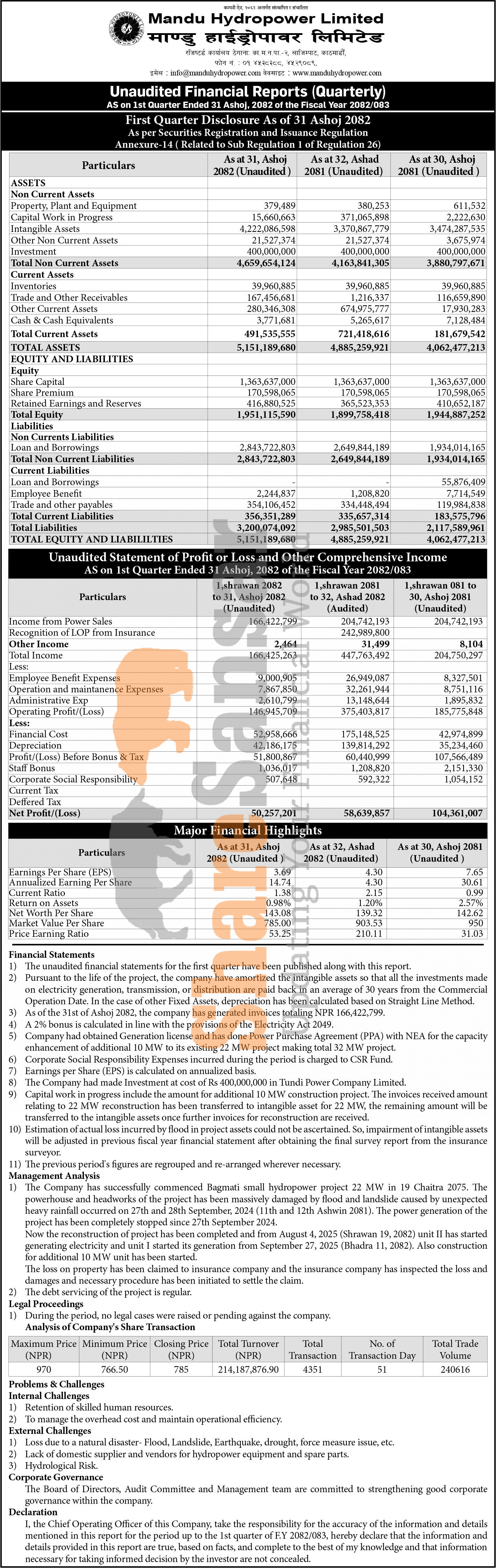 Mandu Hydropower Limited has posted a net profit of Rs 50.25 million and published its 1st quarter company analysis of the fiscal year 2082/83.