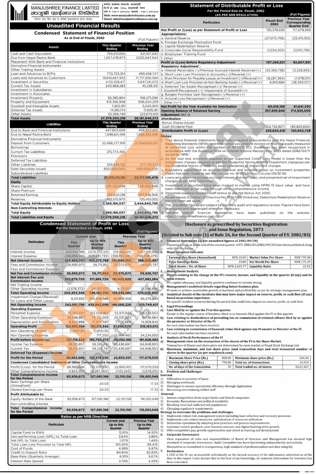 Manjushree Finance Limited has posted a net profit of Rs 135.37 million and published its 2nd quarter company analysis of the fiscal year 2082/83.