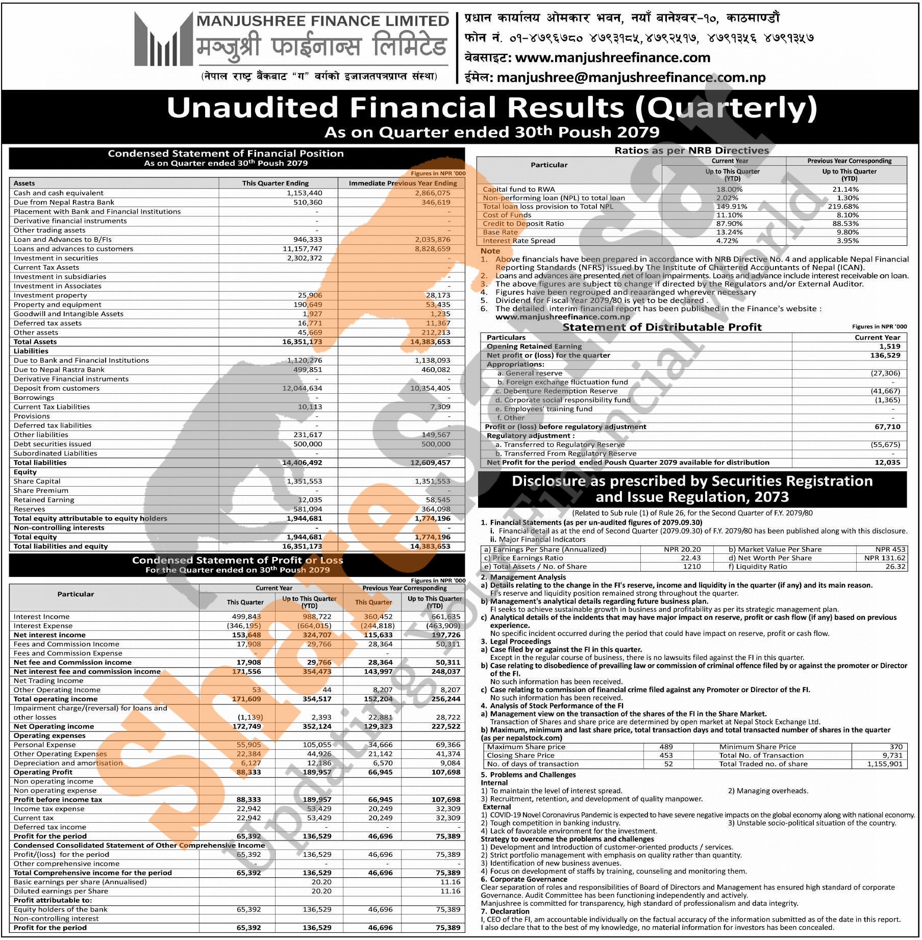 Manjushree Finance Limited has posted a net profit of Rs 136.52 million and published its 2nd quarter company analysis of the fiscal year 2079/80.
