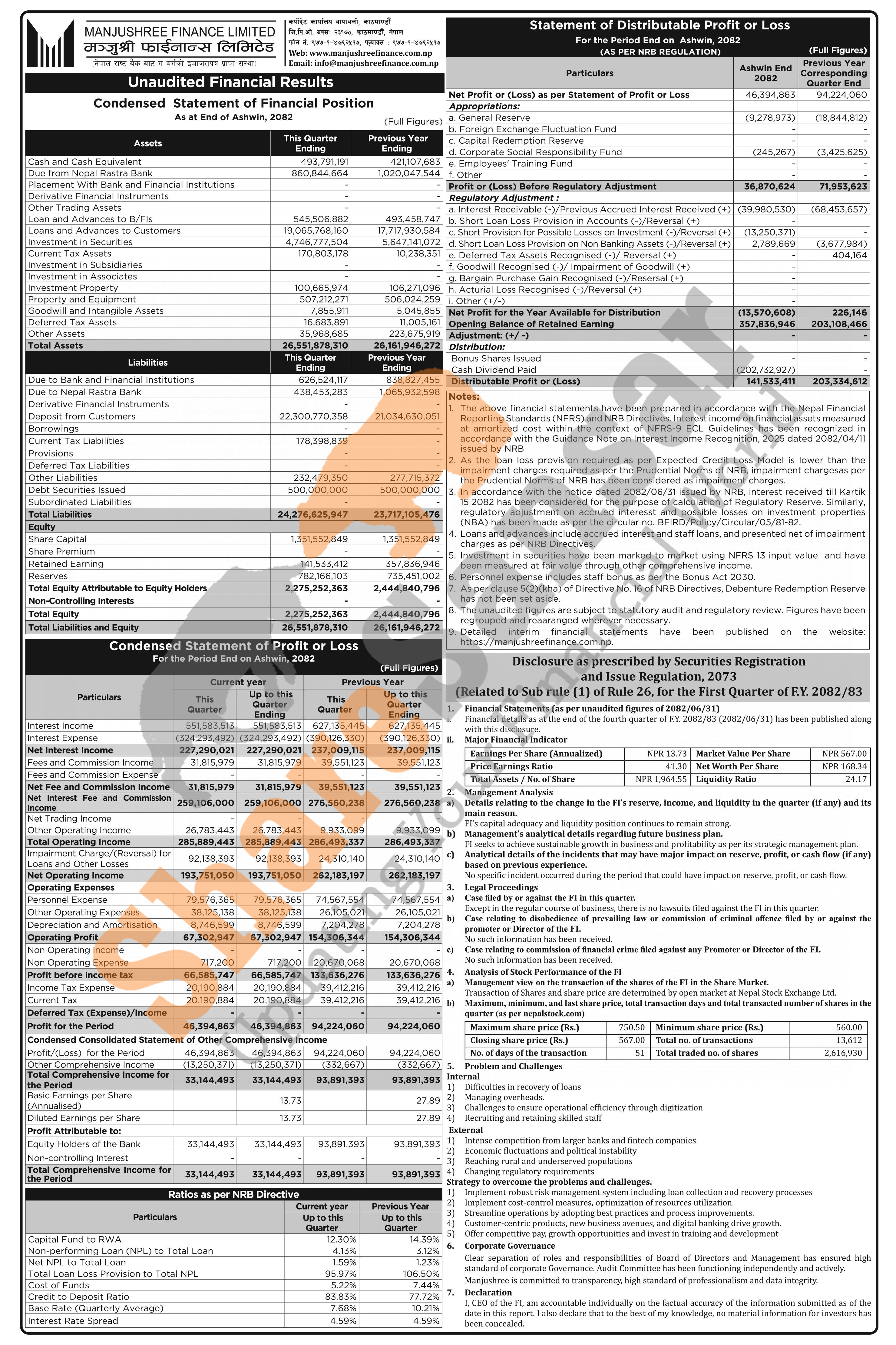 Manjushree Finance Limited has posted a net profit of Rs 46.39 million and published its 1st quarter company analysis of the fiscal year 2082/83.
