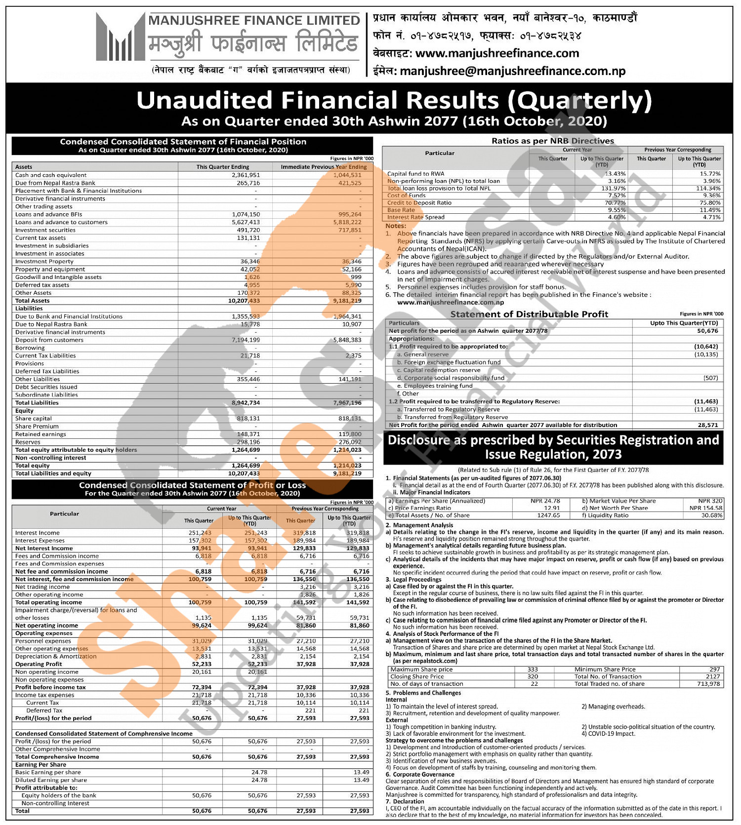 Manjushree Finance Limited has posted a net profit of Rs 50.67 million and published its 1st quarter company analysis of the fiscal year 2077/78.