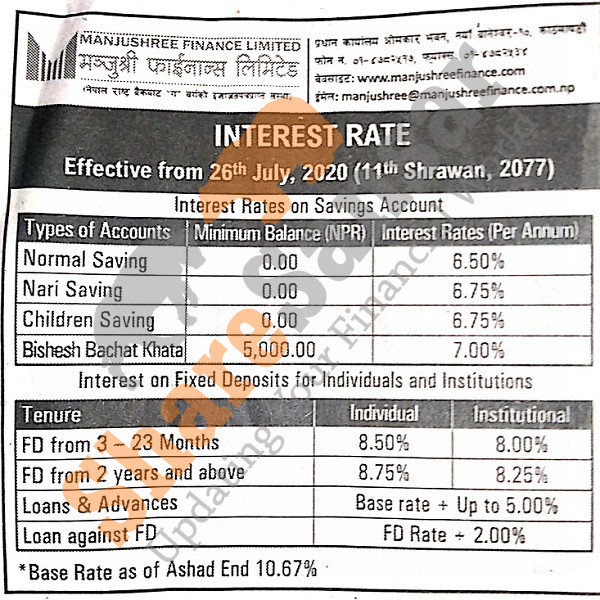 Manjushree Finance Limited has published a notice regarding the interest rate on the various deposit products and its effective from 11th Shrawan, 2077.