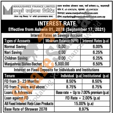 Manjushree Finance Limited has published a notice regarding the new interest rate for deposit and loan products and it's effective from 1st Ashoj, 2078.