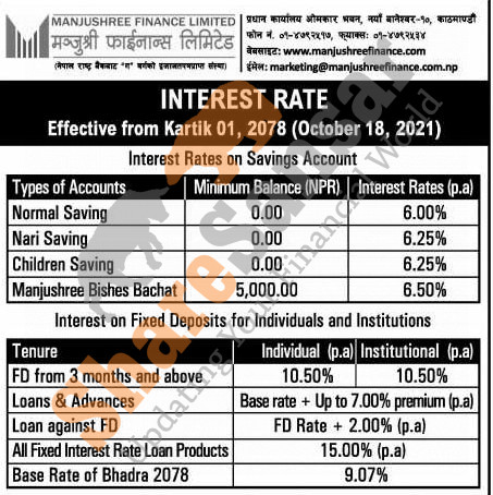Manjushree Finance Limited has published a notice regarding the new interest rate for deposit and loan products and it's effective from 1st Kartik, 2078.