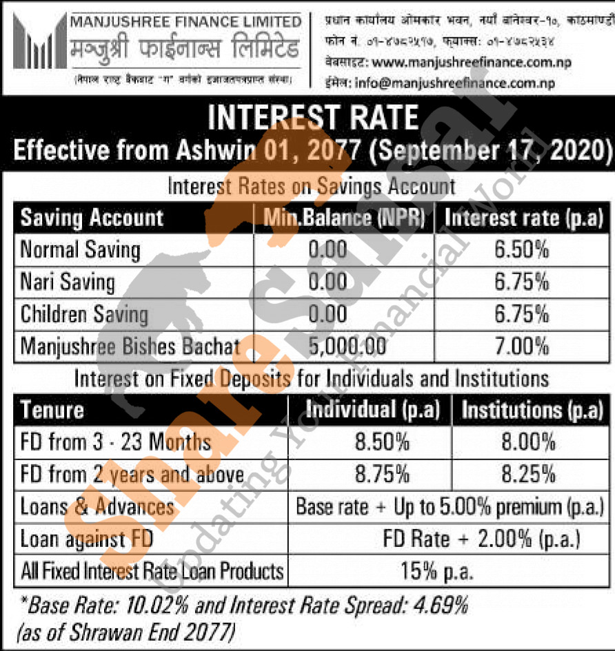 Manjushree Finance Limited has published a notice regarding the new interest rate for its deposit product and its effective from 1st Ashwin, 2077.