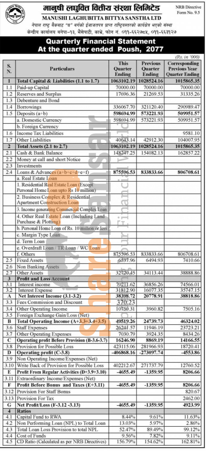 Manushi Laghubitta Bittiya Sanstha Limited has posted a net loss of Rs 4.65 million and published its 2nd quarter company analysis of the fiscal year 2077/78.