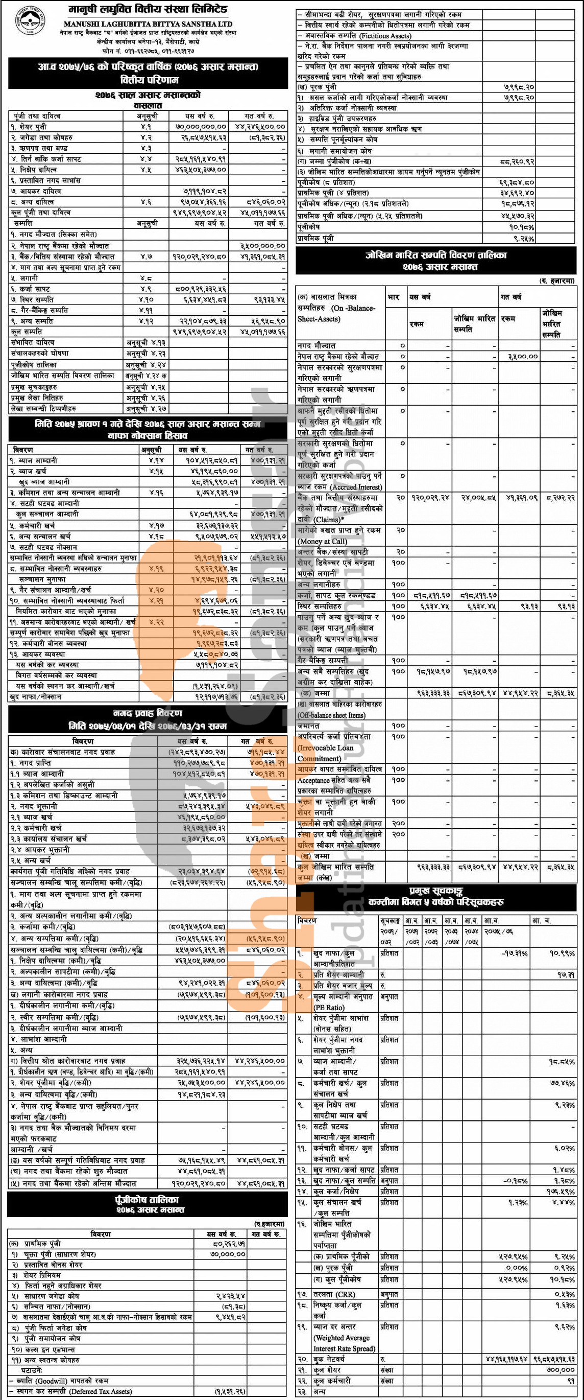 Manushi Laghubitta Bittiya Sanstha Limited has published its annual financial highlights of the fiscal year 2075/76.