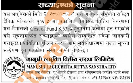 Manushi Laghubitta Bittiya Sanstha Limited has published its correction notice of 1st quarter company analysis of the fiscal year 2078/79.