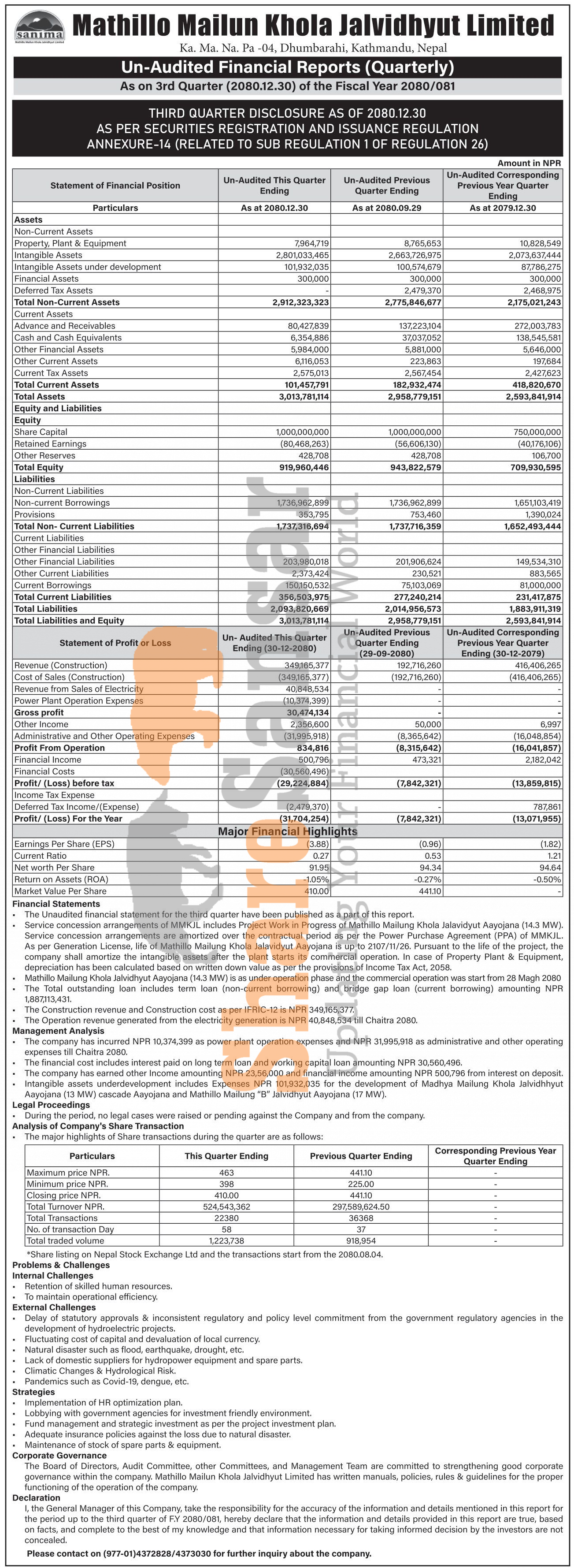 Mathillo Mailun Khola Jalvidhyut Limited has posted a net loss of Rs 31.70 million and published its 3rd quarter company analysis of the fiscal year 2080/81.