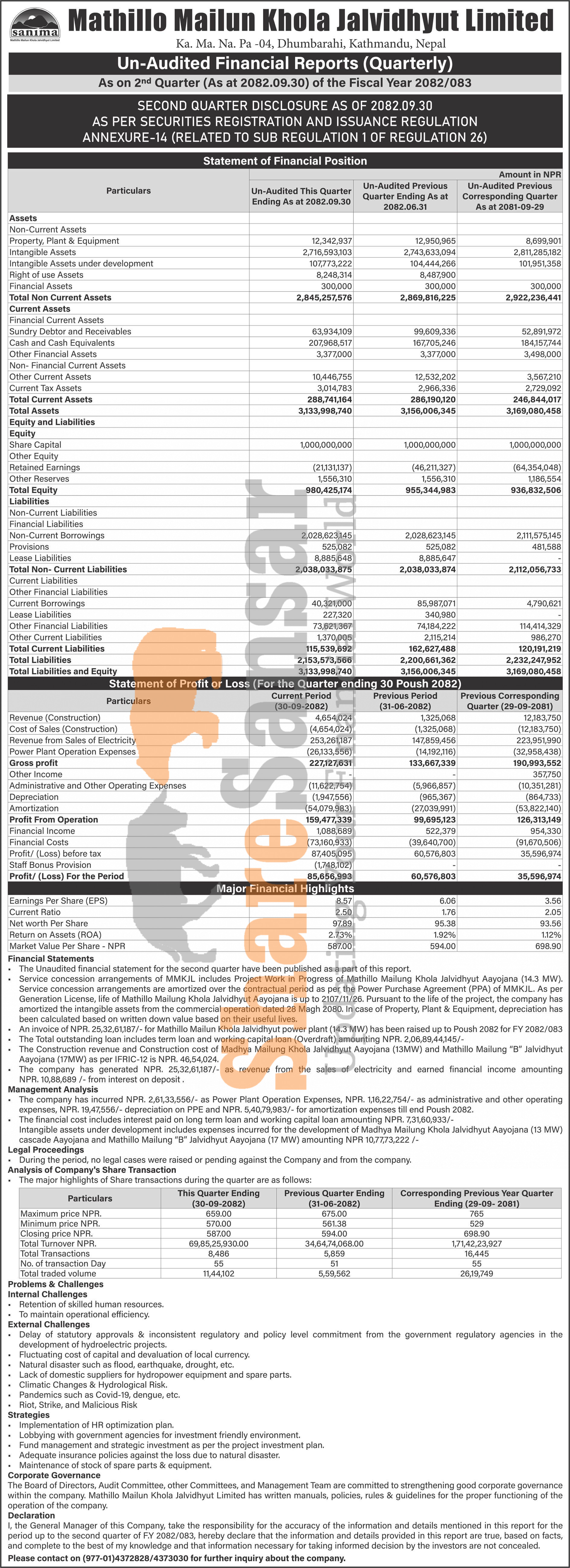 Mathillo Mailun Khola Jalvidhyut Limited has posted a net profit of Rs 85.65 million and published its 2nd quarter company analysis of the fiscal year 2082/83.