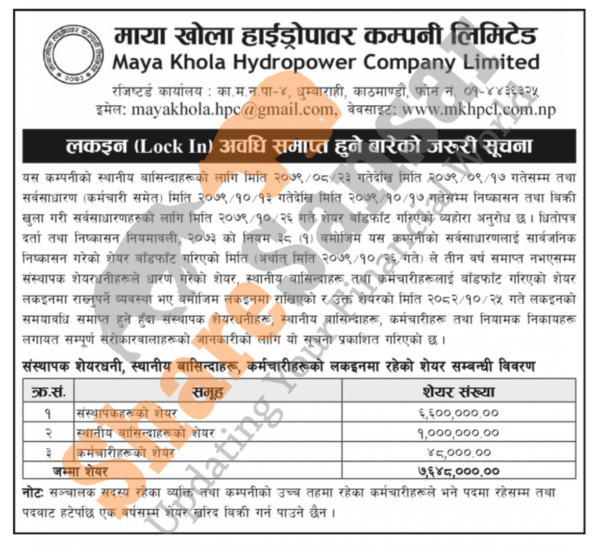Maya Khola Hydropower Company Limited has published a notice regarding the expiration of the lock-in period for its promoters, local residents of the project affected area and employee shares on 25th Magh, 2082.
