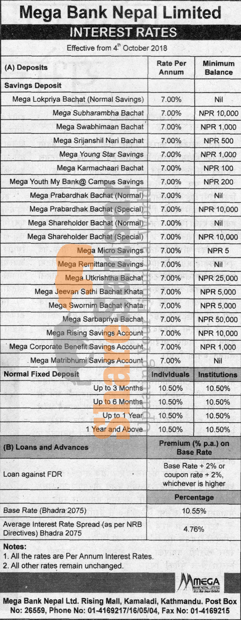 Mega Bank Nepal Limited has published a notice regarding new interest rate and its effective from 18th Ashwin, 2075.