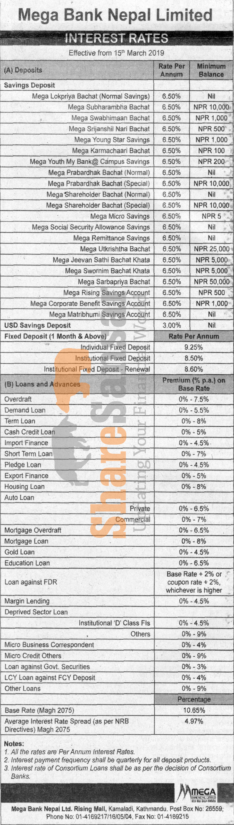 Mega Bank Nepal Limited has published a notice regarding new interest rate and its effective from 1st Chaitra, 2075.