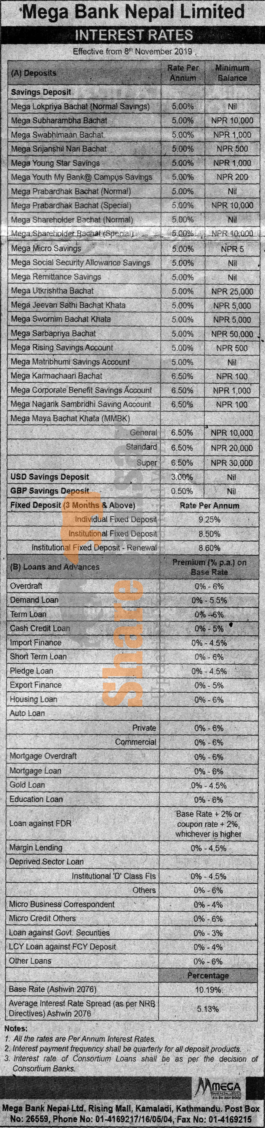 Mega Bank Nepal Limited has published a notice regarding new interest rate and its effective from 22nd Kartik, 2076.