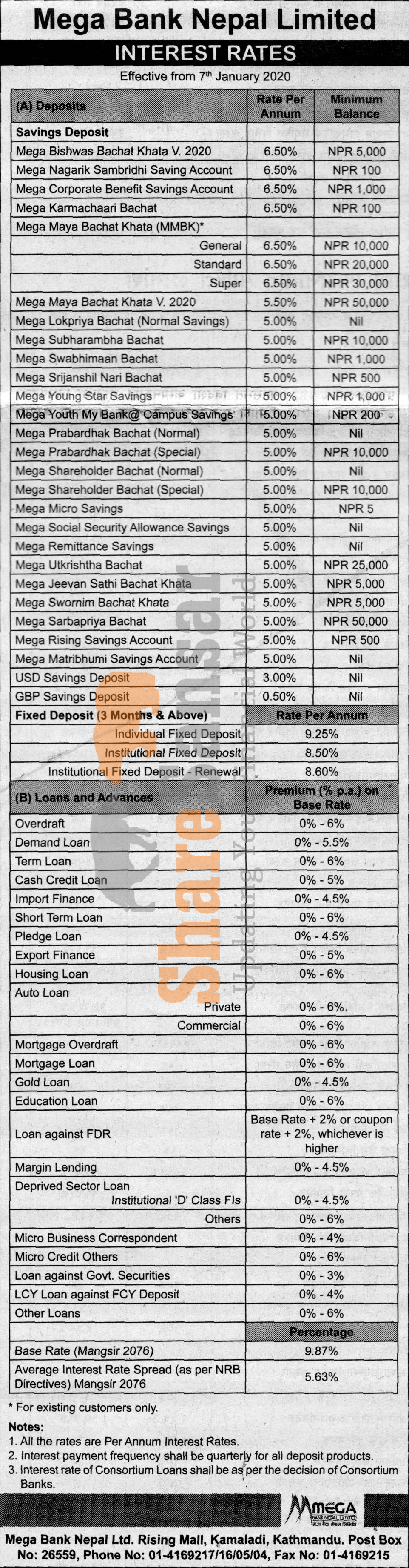 Mega Bank Nepal Limited has published a notice regarding new interest rate and its effective from 22nd Poush, 2076.