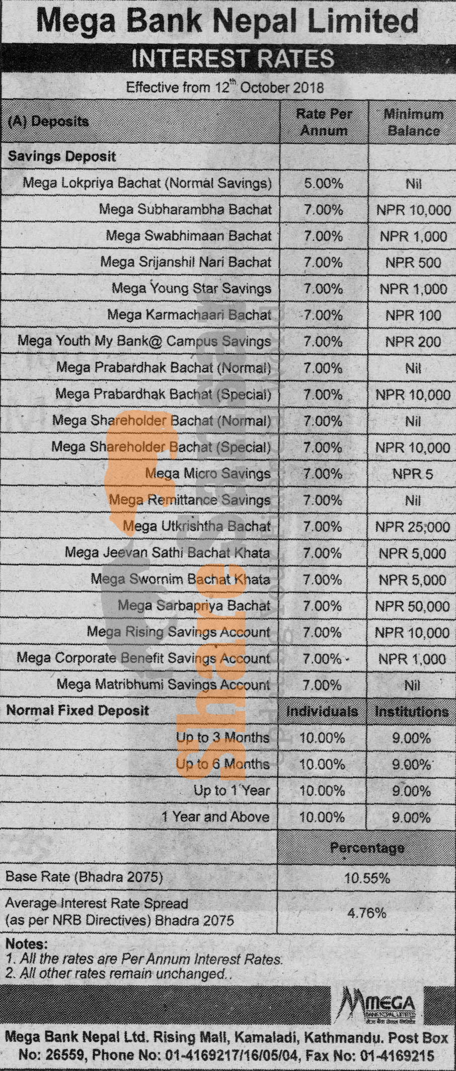 Mega Bank Nepal Limited has published a notice regarding new interest rate and its effective from 26th Ashwin, 2075.